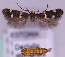 The wingspan is 10–11 millimetres (0.39–0.43 in). The moth flies from June to August depending on the location.[1] The head is light ochreous-yellow, seldom with a fuscous spot. Forewings are dark fuscous ; a somewhat oblique fascia before middle, a smalltornal spot, and another on costa beyond it ochreous-whitish, in female enlarged and more conspicuous. Hindwings are blackish grey.The larva is pale yellow ; head pale brown.[2]