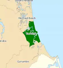 The division of Burleigh is located on the southern Gold Coast, centred on Burleigh Heads. It includes the Gold Coast suburbs of Burleigh Heads, Burleigh Waters, Palm Beach and parts of Varsity Lakes and Tallebudgera.