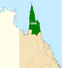 Cook covers the vast Cape York Peninsula north of Cairns, including the resort town of Port Douglas and the Torres Strait Islands. It is named after British navigator James Cook,[1] who charted the coast and landed on Possession Island – one of the Torres Strait islands – in 1770.