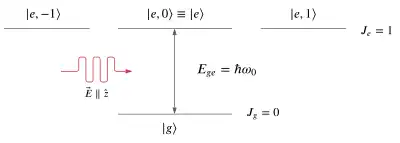 One way of modelling and understanding the effect of light (mainly electric field) on an atom is to look at a simpler model consisting of three energy levels. In this model, we have simplified our atom to a transition between a state of 0 angular momentum (, to a state of angular momentum of 1 (). This could be, for example, the transition in hydrogen between the 1s (ground state) and the 2p () state.