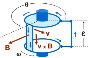 Rectangular wire loop rotating at angular velocity ω in radially outward pointing magnetic field B of fixed magnitude. The circuit is completed by brushes making sliding contact with top and bottom discs, which have conducting rims. This is a simplified version of the drum generator.