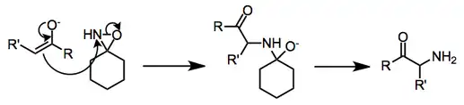 In aminations involving oxaziridines, nucleophilic attack takes place on the nitrogen atom of the three-membered ring. For some substrates (α-cyano ketones, for example), the resulting alkoxide reacts further to afford unexpected products. Straightforward β-elimination of the alkoxide leads to the formation of an amine.[4]