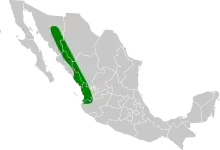 Elegant quails are found only in Mexico, on the Pacific slopes of the Sierra Madre Occidental at altitudes of up to 1,000 m (3,300 ft).[2] Their range extends from Sonora and southwestern Chihuahua to northern Jalisco and they are generally found in thorny scrub and deciduous forest,[3] on open ground and cultivated fields. When disturbed they either freeze or run through the undergrowth, taking to the wing only with reluctance.[4]