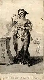 Elizabeth Pierrepont (née Chudleigh), Duchess of Kingston (8 March 1721 – 26 August 1788), sometimes called Countess of Bristol, was an English courtier and courtesan, known by her contemporaries for her adventurous life style. She was the daughter of Colonel Thomas Chudleigh (died 1726), and was appointed maid of honour to Augusta, Princess of Wales, in 1743, probably through the good offices of her friend William Pulteney, 1st Earl of Bath.[1]