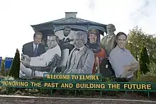 The City Slogan is "Honoring the Past, Building the Future". It is featured on an Entrance sign erected in 2003 into the city from Exit 56 of the Southern Tier Expressway along with honored Elmirans including (L to R) Brian Williams, Hal Roach, Ernie Davis, Mark Twain, Eileen Collins, John Jones, and Tommy Hilfiger. The slogan was designated by Mayor Stephen Hughes following the conclusion of a slogan contest in which Marlin Stewart, Alan and Barbara Hutchinson, and James Lloyd were recognized for their contributions to the winning slogan. In 2021, the sign was defaced as Brian Williams was replaced with Judge Jeanine Pirro.[46]