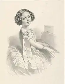 Eloísa María Dolores Juana de la Santísima Trinidad D'Herbil was born on 27 December 1847 in Cádiz, Spain[1][Notes 1] to the Raquel Angel de Cadia and Joseph D'Herbil.[3][Notes 2] She began her training before her fifth birthday[Notes 3] with the American pianist Louis Moreau Gottschalk and auditioned with the Hungarian composer and pianist Franz Liszt.[9] She would remain a devotée of both and often played their music in concert.[3][10] Liszt praised her ability to play Chopin, causing Viennese critics to dub the child prodigy as "Chopin in skirts".[9] By the age of six, she had played for Isabella II of Spain. The following year, she played for Queen Victoria and Prince Albert at Windsor Castle and in June of the same year, gave another concert in England in the Queen's Concert Rooms. Her performance was highly praised by the royals. It was noted that her portrait could be widely seen and that Luigi Fontana was sculpting a bust of the young virtuoso.[11]