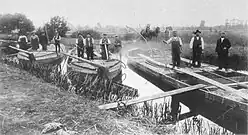 The differences in elevation between the Pulsnitz or the Schwarze Elster and the Elbe were initially overcome using three chamber sluices built in wooden construction, the Prösen sluice (2.80 m), the Gröditz sluice (2.25 m) and the Pulsen sluice (0.65 m) were constructed.[30][31] Due to ongoing issues at the Prösen sluice, it was rebuilt in stone in 1755 and further renewed in 1766/67. Additionally, a fourth sluice, the Elsterwerda sluice, was added in 1766. The chamber sluices had a usable length of 42.70 meters. They were 8.70 meters wide, and the sluice openings on both sides were 5.70 meters. Typically, it took around 12 minutes for a vessel to pass through one sluice.[2]