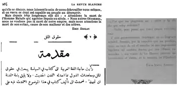 Co-editor Khalil Ghanem (Beirut 1847 – Paris 1903) had taken part in the previous reformist movement known as the Young Ottomans. Member of the first Ottoman parliament in 1877, the French Embassy in Constantinople (now Istanbul) granted him political asylum after his mentor Midhat Pasha was deposed.[6] Before meeting Arslan he had founded and edited al-Bassir (al-Bașīr البصير) weekly (Paris, 1881–1882).[11] Ghanem wrote also for the Journal des débats and was named chevalier of the French Legion of Honour in 1879.[12]