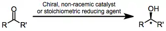 Carbonyl reduction, the net addition of H2 across a carbon-oxygen double bond, is an important way to prepare alcohols. Stoichiometric reducing agents to accomplish this task include lithium aluminium hydride, sodium borohydride, alkoxy borohydrides, alkoxy aluminium hydrides, and boranes. Although stoichiometric chiral reducing agents often afford products with high enantioselectivity, the necessity of a stoichiometric amount of chiral material is a disadvantage.[2]