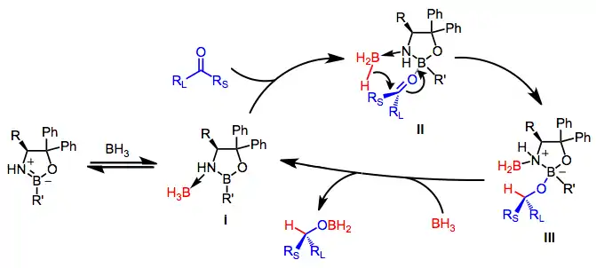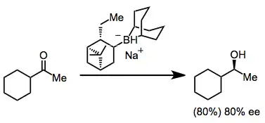 The catalytic, asymmetric reduction of ketones may be accomplished through the use of catalytic amounts of an oxazaborolidine catalyst in conjunction with borane or catecholborane as the stoichiometric reducing agent.[3] Oxazaborolidines remain in common use for reductions of simple ketones.