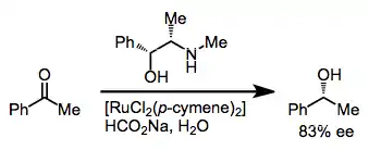 Reduction via the net transfer of hydrogen from one organic molecule to another is known as transfer hydrogenation. Transfer hydrogenation to ketones leads to alcohols (the Meerwein-Ponndorf-Verley reduction), and in the presence of a chiral transition metal catalyst, this process may be rendered enantioselective. In the presence of a chiral diamine, ruthenium catalyzes the enantioselective transfer hydrogenation of aryl ketones with isopropanol.[11] Other metals that have been employed include samarium(III),[12] iridium(I),[13] and rhodium(I).[14] Formic acid and formate salts may also be used as reductants in transfer hydrogenations. Simple aryl ketones are reduced enantioselectively when a chiral amino alcohol ligand is employed.[4]