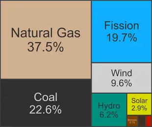 The United States' portion of the electrical grid in North America had a nameplate capacity of 1,213 GW and produced 3,988 TWh in 2021, using 37% of primary energy to do so.[6][7] The country is the second-largest producer and consumer of electricity, behind China.[3] Natural gas overtook coal as the dominant source for electric generation in 2016. While coal use has been dropping, it remained larger than either nuclear or renewables.[6]