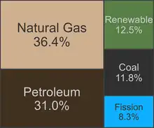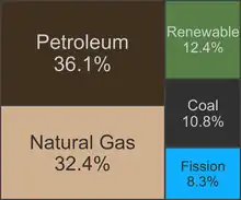 Energy in the United States is obtained from a diverse portfolio of sources, although the majority came from fossil fuels in 2021, as 36% of the nation's energy originated from petroleum, 32% from natural gas, and 11% from coal. Electricity from nuclear power supplied 8% and renewable energy supplied 12%, which includes biomass, wind, hydro, solar and geothermal.[1]