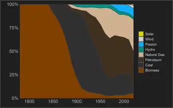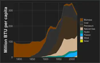 From its founding until the late 19th century, population and energy use in the United States both increased by about 3% per year,[8][9] resulting in a relatively constant per capita energy use of 100 million BTU. Wood made up the majority of this until near the end of the 1800s, meaning the average American burned eight tons of wood each year.[10]