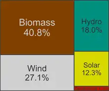 Biomass made up 5% of total production and 38% of renewables in 2022.[20] About 49% of this was biofuels, 43% was wood, and 8% was waste and other biomass.