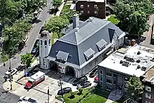 The first fire station east of the Anacostia River was built in 1898. This station, designed by the Washington, D.C. architectural firm of Averill and Adams, was the fourth built there in 1910. The eclectic style, principally French revival, reflected the desire by the Office of the Municipal Architect to create unique designs for new fire stations.[2] At the time, this part of the District of Columbia was considered a suburban district because it was beyond public water service and the street alarm system. Chemical Company Number 2 was housed here for that reason. The building's hose tower was also used as a lookout post. It joined with the last of the District's Chemical companies in being converted to a regular engine company on January 1, 1921 when it became Engine Company 19.[3] In 1925 it was the last company in the department to switch from horse drawn apparatus to motorized.
