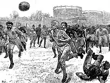 An illustration of an 1872 England vs Scotland representative match. The background shows the distinctive gas holder of The Oval.