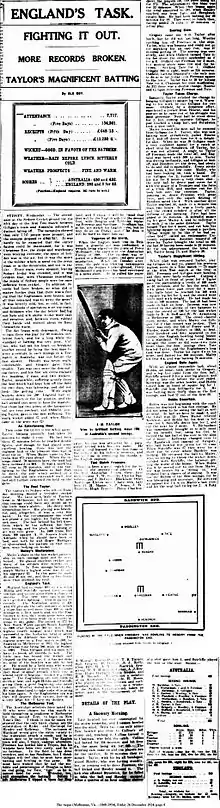 Newspaper article describing batting on the fifth day of the first Ashes test, with Taylor's 108 in the record 10th wicket partnership.