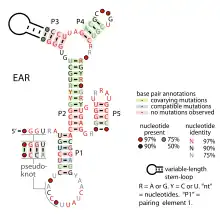 The combination of comparative sequence alignments and structural probing data revealed that the secondary structure of the EAR RNA consists of five helical segments (P1-P5) and a pseudoknot[1][2] (see diagram). In general, mutations that disrupt the conserved helical regions eliminate biofilm formation by B. subtilis, whereas mutations in nonconserved, variable regions exhibit no such effect.[1] Thus, the secondary structure of EAR plays an important role for its function in vivo.