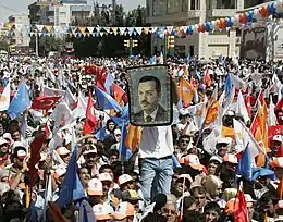 Erdoğanism or Tayyipism[1] (Turkish: Erdoğancılık or Tayyipçilik) refers to the political ideals and agenda of Turkish President and former Prime Minister, Recep Tayyip Erdoğan, who became Prime Minister in 2003 and served until his election to the Presidency in 2014. With support significantly derived from charismatic authority, Erdoğanism has been described as the "strongest phenomenon in Turkey since Kemalism" and used to enjoy broad support throughout the country[2] until the 2018 Turkish economic crisis which caused a significant decline in Erdoğan's popularity.[3][4] Its ideological roots originate from Turkish conservatism and its most predominant political adherent is the governing Justice and Development Party (AK Parti), a party that Erdoğan himself founded in 2001.