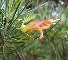There is variation in flower shape, the most common being two petals at the top of the tube and three below, with the stamens enclosed in the tube as in the case of E. exilifolia. Species with this arrangement are generally insect-pollinated, the lower petals acting as a landing area. Less common are those that have four petal lobes at the top of the flower, one below which is curled under the flower and the stamens extending beyond the petal tube, as in the case of E. glabra. These flowers are generally bird pollinated, the bird holding the plant stem while it visits the flower. A few others have flowers with a combination of these arrangements.[2][3][4]