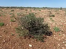 Spiny poverty bush grows in sand, clay or loam soils between Wiluna and Carnegie Station[3] in the Gascoyne, Little Sandy Desert and Murchison biogeographic regions.[6]