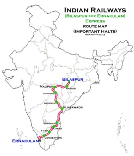 It operates as train number 22816 from Ernakulam Junction to Bilaspur Junction and as train number 22815 in the reverse direction, serving the states of Kerala, Tamil Nadu, Andhra Pradesh, Telangana, Maharashtra & Chhattisgarh.[2]