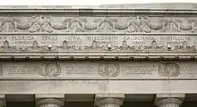 The neoclassical Lincoln Memorial in Washington was designed by Henry Bacon, Work started on 12 February 1914 and the work was dedicated on 30 May 1922. Bairstow undertook the carvings on the exterior of the monument, including eagles, festoons, wreathes and the states.[8] Bairstow began to carve the friezes and inscriptions of the monument as soon as the stone of the upper parts of the monument was in place.[9] On the main frieze, he carved the names of the states and the wreathes in place. He probably roughed out the garlands and eagles of the attic frieze in the workshop.[10]