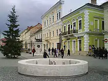 The pedestrian area on Eroilor Boulevard in Cluj-Napoca, with the Lupa Capitolina Statue and the Bolyai János house (the green building)