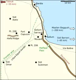 The British Western Desert Force had meanwhile been weakened by the transfer in mid-February of three divisions for the Battle of Greece.[114] They fell back to Mersa El Brega and started constructing defensive works.[115] After a day of fierce fighting on 31 March, the Germans captured Mersa El Brega.[116] Splitting his force into three groups, Rommel resumed the advance on 3 April. Benghazi fell that night as the British pulled out of the city.[117][118] Gariboldi, who had ordered Rommel to stay in Mersa El Brega, was furious. Rommel was equally forceful in his response, telling Gariboldi, "One cannot permit unique opportunities to slip by for the sake of trifles."[119] A signal arrived from General Franz Halder reminding Rommel that he was to halt in Mersa El Brega. Knowing Gariboldi could not speak German, Rommel told him the message gave him complete freedom of action. Gariboldi backed down.[120] Throughout the campaign, fuel supply was problematic, as no petrol was available locally; it had to be brought from Europe by tanker and then carried by road to where it was needed.[121][122] Food and fresh water were also in short supply, and it was difficult to move tanks and other equipment off-road through the sand.[123] Cyrenaica was captured by 8 April, except for the port city of Tobruk, which was besieged on 11 April.[124][125]