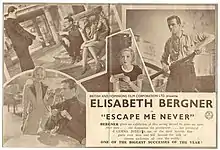 Escape Me Never is a 1935 British drama film directed by Paul Czinner, produced by Herbert Wilcox, and starring Elisabeth Bergner (recreating the role of Gemma as she created it onstage in New York and London), Hugh Sinclair and Griffith Jones.[3][4] The score is by William Walton with orchestration by Hyam Greenbaum.[5] Bergner was nominated for the Oscar for Best Actress for her performance, but lost to Bette Davis. British readers of Film Weekly magazine voted the 1935 Best Performance in a British Movie to her.[6] The film is an adaptation of the play Escape Me Never by Margaret Kennedy, which was based upon her 1930 novel The Fool of the Family. That book was a sequel to The Constant Nymph, which was also about the Sanger family of musical geniuses, but there is a disjunct among the books and the films: the Sanger brothers are never mentioned in the 1943 film version of The Constant Nymph. Another film adaptation of Escape Me Never was made in 1947 by Warner Bros.