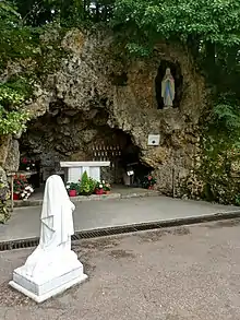 The grotto was created in 1884, five years after the death of Bernadette, demanded by Marie Therese Vauzou, the mother superior of the convent who also served as the mistress of novices during Bernadette's novitiate. It was constructed to resemble the grotto in Lourdes, and a piece of rock that the Virgin Mary stood on was taken from the grotto of Massabielle and attached to the replica grotto in Nevers. The grotto also offers candles that can be bought and lit in the grotto which feature a picture of Bernadette on them.[4]