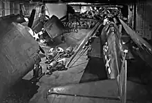The hangar area design came in for many design conferences between the naval bureaus. Not only were the supporting structures to the flight deck required to carry the increased weight of landing and parked aircraft, but they were to have sufficient strength to support the storing of spare fuselages and parts (50% of each operational plane type aboard, hence 33% of carried aircraft) under the flight deck and still provide adequate working space for the men using the area below.