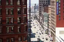 ![]() Looking westbound on Euclid Avenue from above E. 9th Street and the Schofield Building. The Soldiers' and Sailors' Monument can be seen in the distance. | |