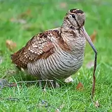The Eurasian woodcock (Scolopax rusticola) is a medium-small wading bird found in temperate and subarctic Eurasia. It has cryptic camouflage to suit its woodland habitat, with reddish-brown upperparts and buff-coloured underparts. Its eyes are set far back on its head to give it 360-degree vision and it probes in the ground for food with its long, sensitive bill, making it vulnerable to cold weather when the ground remains frozen.