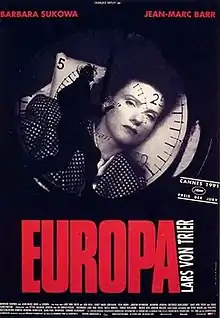 Europa (known as Zentropa in North America) is a 1991 experimental psychological drama period film[8][9] directed and co-written by Lars von Trier. The film is an international co-production between Denmark and five other European countries, it is von Trier's third theatrical feature film, and the third and final installment in his Europa trilogy, following The Element of Crime (1984) and Epidemic (1987).[10]