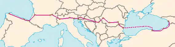 The E 70 routes through ten European countries, and includes one (not currently operational) sea-crossing, from Varna in Bulgaria to Samsun in Turkey.