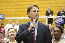 Bayh headlined the Jefferson-Jackson dinner for Michigan in the first week of April,[21] and made rounds on political talk shows throughout the month. He weighed in on the immigration debate, stating that the government should come up with a solution "without rewarding [and] violating the law, to bring [illegal immigrants] out of the shadows" and to "impose fines, [perform] criminal background checks" while making sure the immigrants "pay back taxes [and] learn English." He elaborated that it was in America's "national security interest" to give the immigrants "some kind of regular status here."[22] Later in the month, he traveled to North Carolina to deliver the keynote address at the Jefferson-Jackson dinner, just as he planned earlier in the year.[23]