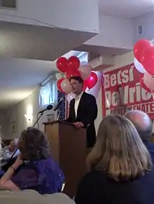 The Democratic takeover of Congress during the 2006 Mid-term elections was a victory for Bayh, who had helped three Iowan congressional candidates win their races during campaigning, and whose efforts culminated in a Democratic majority in the state's legislature.[40] In regards to the election, he stated that "we (the Democrats) won by turning the red states of the heartland blue".[41] In mid-November, the candidate traveled to the West Coast for a fundraising tour.[42] Late in the month, polls revealed that Bayh had a 43.3% likability rating among the American public, slightly ahead of the last placed finisher John Kerry at 39.6%.[43]