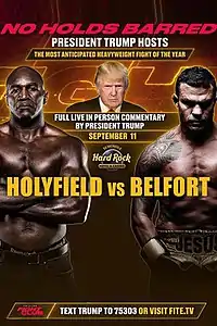 Evander Holyfield vs. Vitor Belfort billed as "No Holds Barred", was an exhibition boxing match between former undisputed heavyweight world champion Evander Holyfield and former UFC light-heavyweight champion Vitor Belfort on September 11, 2021, at the Seminole Hard Rock Hotel & Casino Hollywood in Miami, Florida. Belfort won the fight by TKO at 1:49 of the first round. The fight sold 150,000 PPV buys.[1]