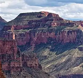 Evans Butte is a 6,379-foot-elevation (1,944-meter) summit located in the Grand Canyon, in Coconino County of northern Arizona, US.[2] It is situated at the north end of Sagittarius Ridge, three miles south-southwest of King Arthur Castle, and two miles southeast of Dox Castle. Topographic relief is significant as it rises over 4,100 feet (1,200 meters) above the Colorado River in 2.5 miles (4.0 km), and the north aspect rises 2,700 feet above Flint Creek in one mile. According to the Köppen climate classification system, Evans Butte is located in a cold semi-arid climate zone, with precipitation runoff draining west to the Colorado River via Shinumo Creek, Hotauta Canyon, and Monadnock Amphitheater.[4] The butte is composed of Pennsylvanian-Permian Supai Group overlaying the cliff-forming Mississippian Redwall Limestone, and Cambrian Tonto Group.[5] Evans Butte was climbed solo by Harvey Butchart on October 11, 1976, thereby making it the 76th of the 83 summits which he climbed in the Grand Canyon.[3]