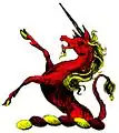 The recorded coat of arms for the Every family of Wycroft Castle (granted 1604) is or, four chevronels gules; the crest being a demi-unicorn couped gules, maned, tired, hoofed or. [18] The Baronets of Egginton add the Red Hand of Ulster as a blazon to denote their title, and have as a crest a unicorns head couped proper.[19]