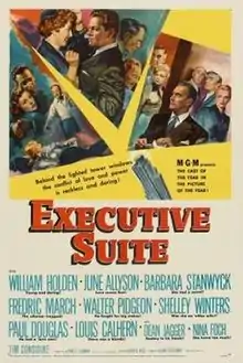 Executive Suite is a 1954 American Metro-Goldwyn-Mayer drama film directed by Robert Wise and written by Ernest Lehman, based on the 1952 novel of the same name by Cameron Hawley. The film stars William Holden, June Allyson, Barbara Stanwyck, Fredric March, Walter Pidgeon, Shelley Winters, Paul Douglas, Louis Calhern, Dean Jagger, and Nina Foch.[3][4] The plot depicts the internal struggle for control of a furniture manufacturing company after the unexpected death of the company's CEO. Executive Suite was nominated for multiple Academy Awards, including for Nina Foch's performance, which earned a Best Supporting Actress nomination.
