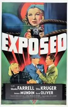 Exposed is a 1938 American drama film starring Glenda Farrell, Otto Kruger and Herbert Mundin. The film was directed by Harold D. Schuster and is based on George R. Bilson's unpublished story "Candid Camera Girl".[2][3][4] It was released by Universal Pictures on November 4, 1938. A magazine photo-newswoman tried to make amends after exposing a lawyer and complication ensues when they fall in love.