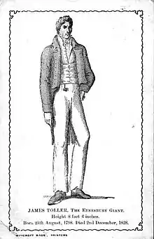 James Toller was born in Eynesbury in 1798. He grew to be 8 ft 1+12 inches (2.475m) tall, although some sources claim 8 ft 6in (2.591m). His parents were of ordinary stature. By the age of eighteen years he had grown to be over eight feet (2.44m) in height, and his feet were 15 inches in length.
