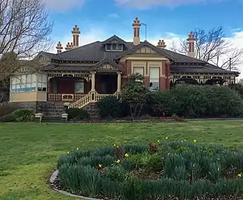 Joseph Bryant (1849–1917), an Englishman from Altarnun in Cornwall, England, who arrived in Australia in 1863, had been very successful as investor and mine manager in the gold mines at Clunes, Victoria,[17] including the North Clunes Mining Co., one of the richest in the district in its day [18][19][20] He commissioned local architect F.W. Turton to build a large residence in the "American-Swiss" style, according to an article in Ballarat and District 1901. The house was designed around a central skylight foyer with rooms and corridors radiating from it. The house originally had seven bedrooms, some which have now been converted into a bathroom and toilet.