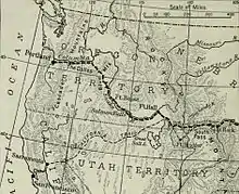 A number of Oliver Meeker's friends from Indianapolis joined the group before the party left Iowa.[10] They crossed the Missouri River at the small Mormon settlement of Kanesville (today Council Bluffs, Iowa). Meeker recounted that, as he stood on the far side of the Missouri, he felt as if he had left the United States. As they journeyed westward along the Platte River in Nebraska Territory, there were such large numbers traveling that they were never out of sight of the tens of thousands of other pioneers journeying west that year.[14] Sometimes several wagons advanced side by side.[15] The Meekers chose a slow, steady pace, unlike many who sought to rush along as quickly as possible. Piles of abandoned possessions lined the way, cast aside to lighten loads. As the party went further west, they passed some of those who had hurried past them, and whose wagons had broken down or whose oxen had died as a result of failure to care for them properly. Disease was an ever-present risk; at the present site of Kearney, Nebraska, Oliver Meeker was stricken with illness. This led to a division of the group when most of Oliver's friends, including later Idaho Territory governor David W. Ballard, refused to wait. Oliver recovered after four days, and was one of the lucky ones—his brother later estimated that one in ten of those who took the Trail perished during the journey. Ezra Meeker remembered meeting one wagon train, slowly moving east against the flow of traffic. That group had made it as far as Fort Laramie (today in Wyoming) before losing the last of its menfolk, and the women and children turned back, hoping to regain their homes in the East. He never learned if they made it.[10][14] According to local historians Bert and Margie Webber, "all of these deaths made a great impression on the young man".[15]