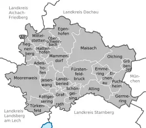 Fürstenfeldbruck is a Landkreis (district) in Bavaria, Germany. It is bounded by (from the east and clockwise) the city of Munich and the districts of Munich, Starnberg, Landsberg, Aichach-Friedberg and Dachau.