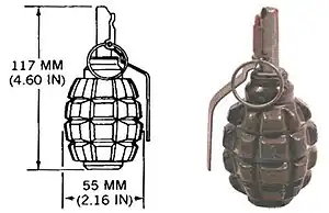 Due to its shape and its yellow-green color, it is nicknamed the limonka (fem. "little lemon"). It is also nicknamed Efka (Russian: Эфка) for the letter F.[2] It is similar to the American Mk 2 "pineapple grenade", which was also ultimately modeled on the French F-1.