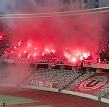 Universitatea's fans have a good friendship with Dinamo's fans, the main rivals of FCSB and Rapid. Dinamo friendship started in the mid-1990s, both ultras groups being linked with "the mentality, fanaticism and nationalist side",[32] although in the 1970s and 1980s, "U" supporters had friendships with other important clubs fans, like Poli Timișoara or Rapid București, these teams being the few that already had fan-groups.[27]